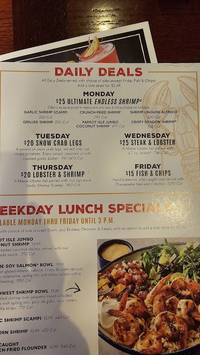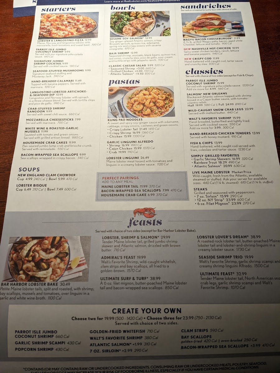 Red Lobster offers a rich menu that beautifully celebrates fresh seafood with American classics and family-friendly options. The Create Your Own Ultimate Feast lets you customize a memorable meal with choices like snow crab legs, grilled sea scallops, Maine lobster tail, Atlantic salmon, and various shrimp preparations including garlic shrimp scampi and coconut shrimp. For lighter or health-conscious diners, the Salad & Bowls section impresses with dishes such as the Sesame Soy Salmon Bowl and Southwest Shrimp Bowl—vibrant, flavorful bowls balanced with fresh greens and zesty dressings.